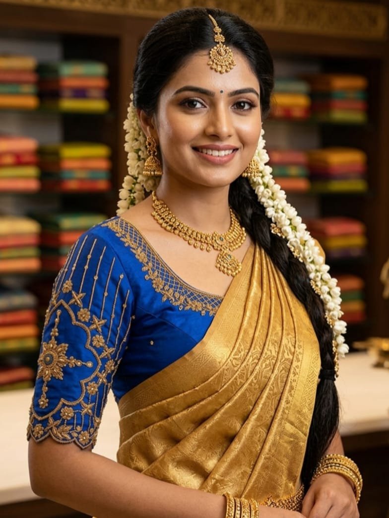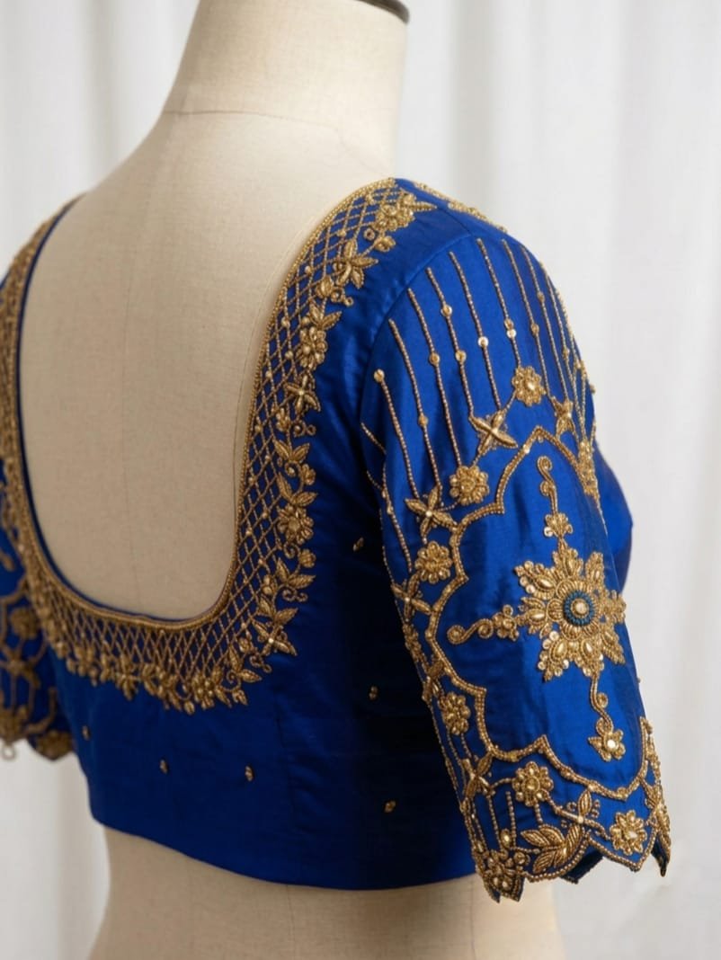 The rich royal blue base brings depth and grace, while the finely detailed golden Aari work adds a luxurious touch, creating a regal and eye-catching finish. Every stitch showcases expert craftsmanship, making this blouse not just an outfit, but a statement piece.