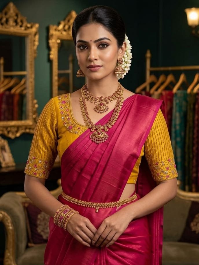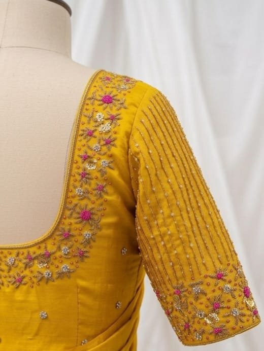 Step into effortless elegance with this charming yellow and pink Aari work blouse — a perfect blend of tradition, color, and model.