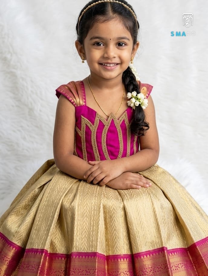 The frock is designed with a comfortable fit, allowing ease of movement for kids while ensuring a stylish silhouette. The vibrant color combinations enhance the beauty of the Aari work, making it a perfect choice for traditional events and photoshoots.