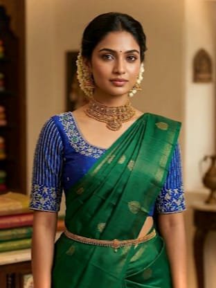 Step into elegance with this stunning Pepsi blue blouse, beautifully enhanced with intricate green thread Aari work that creates a striking and refreshing contrast. The rich depth of the blue fabric adds a royal touch, while the vibrant green embroidery brings life and artistic charm to the overall design.