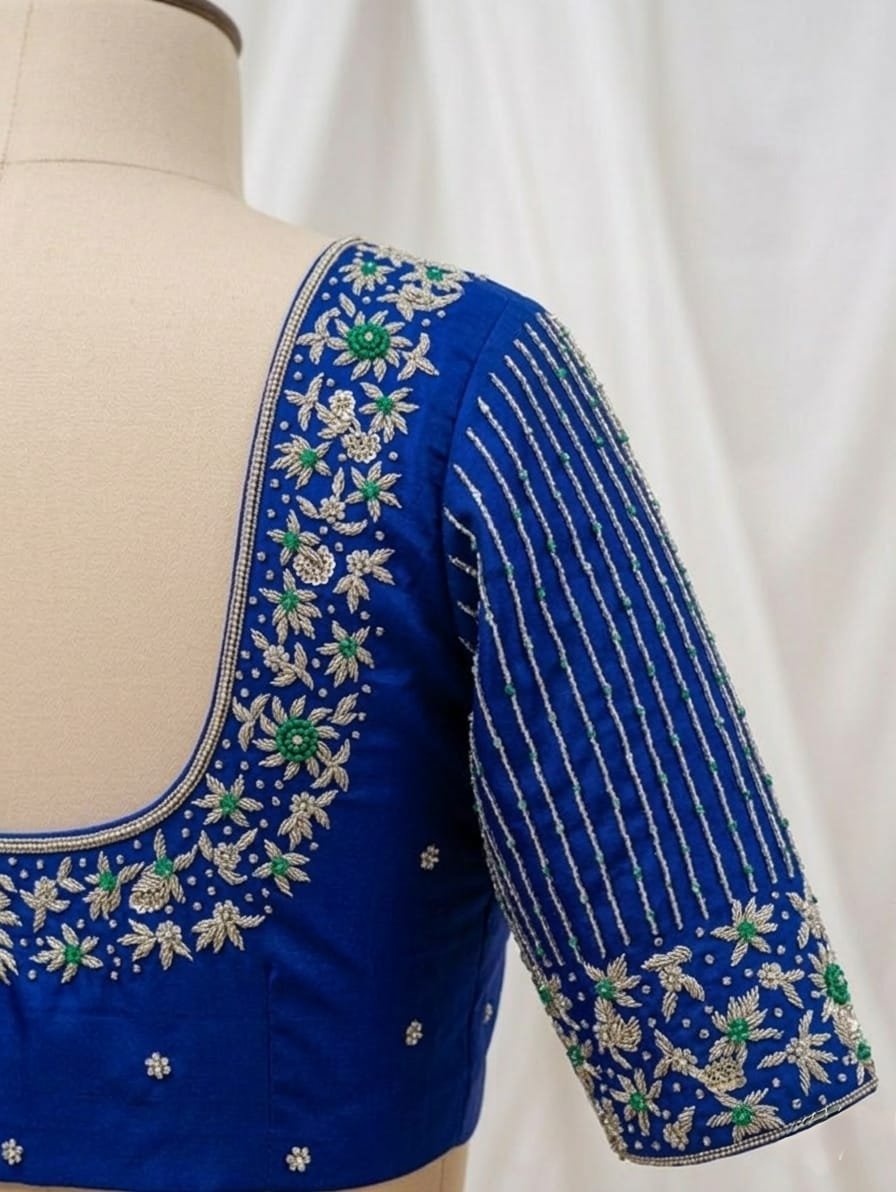 Luxury Contrast Blouse in Pepsi Blue with Green Thread Detailing Work