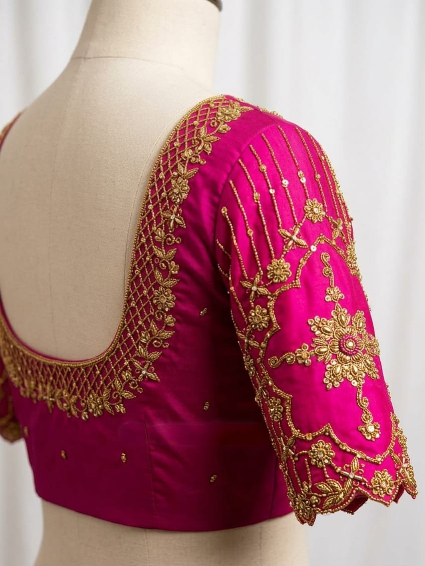 Royal Pink Aari Blouse with Elegant Golden Handwork